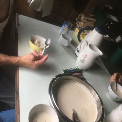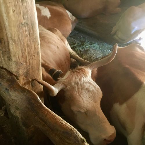 Heute muss der Sohn und seine Familie ins Tal. Sie müssen Kühe zum Schlachten bringen und andere Dinge erledigen. Das heisst, dass der Senior Hans und ich alleine oben bleiben.